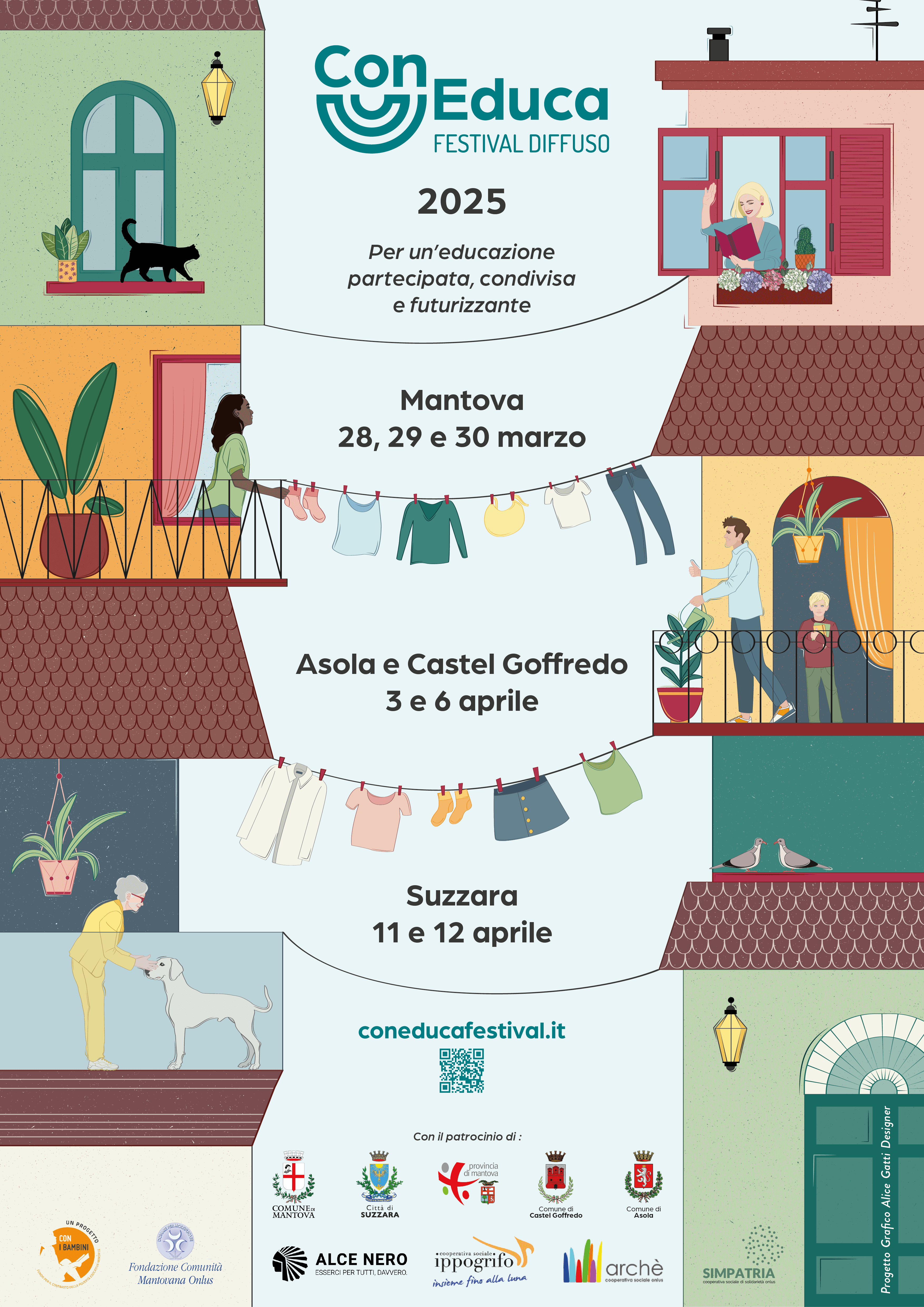 Fondazione Comunità Mantovana capofila del progetto “I migliori anni della loro vita”, insieme ai partner Cooperativa Alce Nero, Cooperativa Archè, Cooperativa Ippogrifo e Cooperativa Simpatria e con i patrocini di Provincia di Mantova, Comune di Mantova, Comune di Asola, Comune di Castel Goffredo e Comune di Suzzara, hanno il piacere di invitarvi a ConEduca Festival Diffuso.