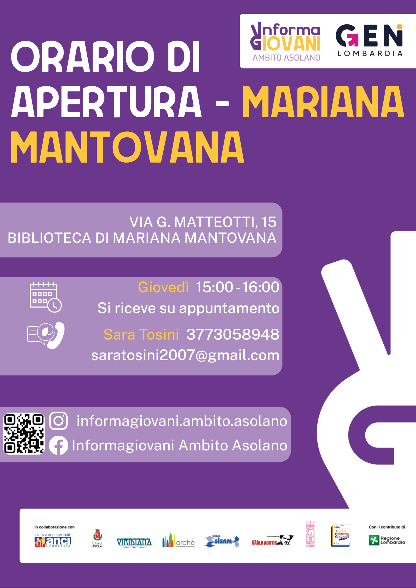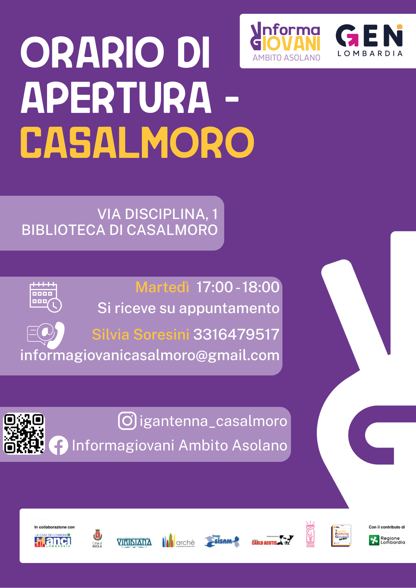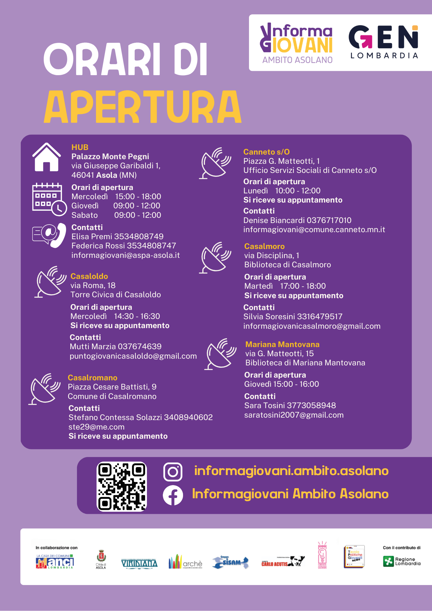 L'Informagiovani di Ambito Asolano rientra all’interno di Hub&feeler, un progetto promosso dai Comuni del Distretto dell’Asolano in collaborazione con ANCI e con il contributo di Regione Lombardia, che mira a rafforzare le opportunità per i giovani nei 12 Comuni dell’Ambito territoriale di Asola (Acquanegra sul Chiese, Asola, Canneto sull'Oglio, Casalmoro, Casaloldo, Casalromano, Castel Goffredo, Ceresara, Gazoldo degli Ippoliti, Mariana Mantovana, Piubega e Redondesco).