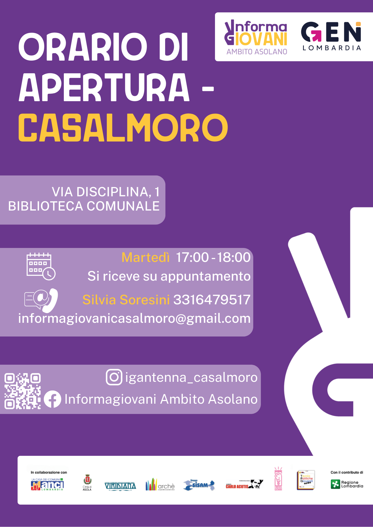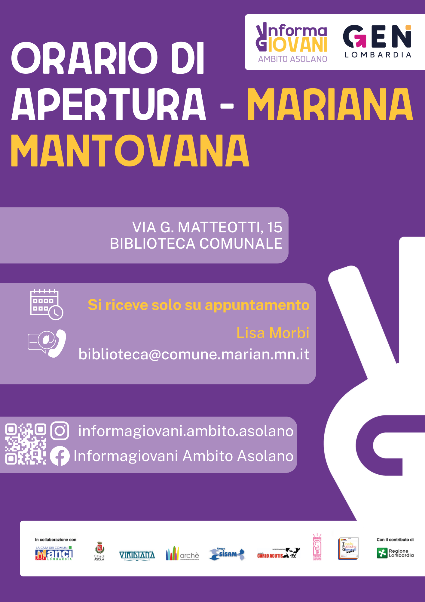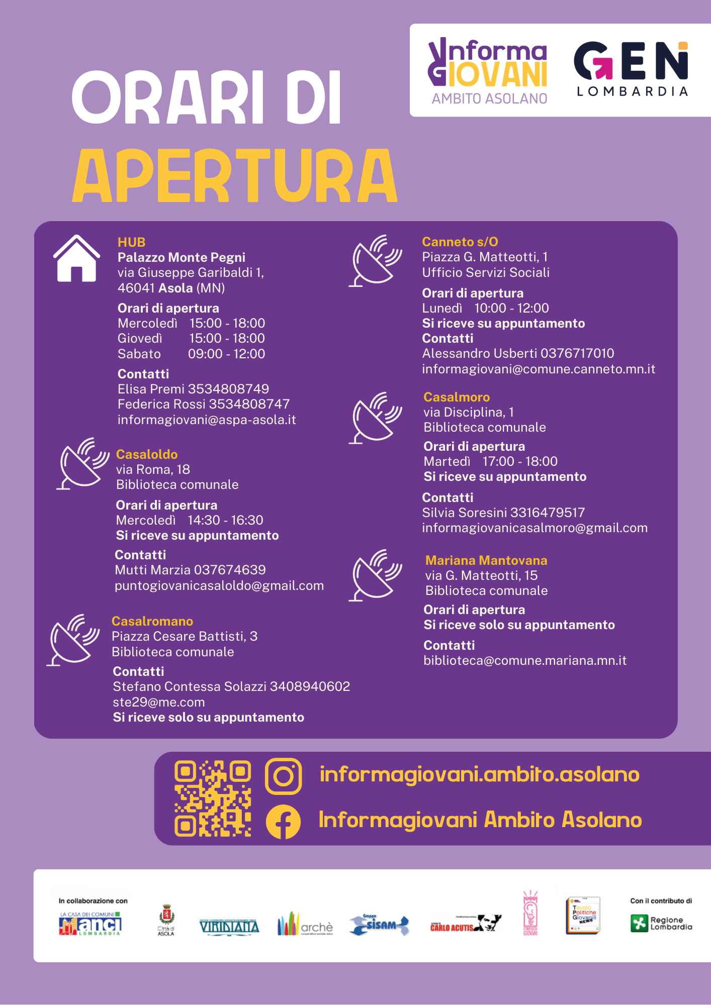 L'Informagiovani di Ambito Asolano rientra all’interno di Hub&feeler, un progetto promosso dai Comuni del Distretto dell’Asolano in collaborazione con ANCI e con il contributo di Regione Lombardia, che mira a rafforzare le opportunità per i giovani nei 12 Comuni dell’Ambito territoriale di Asola (Acquanegra sul Chiese, Asola, Canneto sull'Oglio, Casalmoro, Casaloldo, Casalromano, Castel Goffredo, Ceresara, Gazoldo degli Ippoliti, Mariana Mantovana, Piubega e Redondesco).